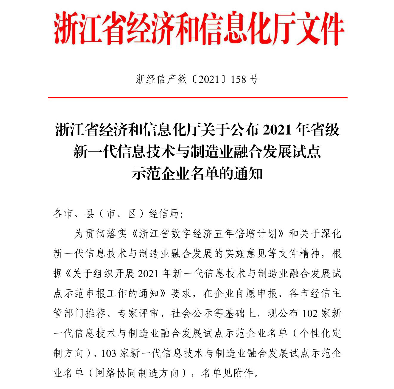 必一电气获得省级新一代信息技术与制造业融合发展试点示范企业,全省103家,必一排在第53家,嘉兴市一共20家,必一排在第5家。